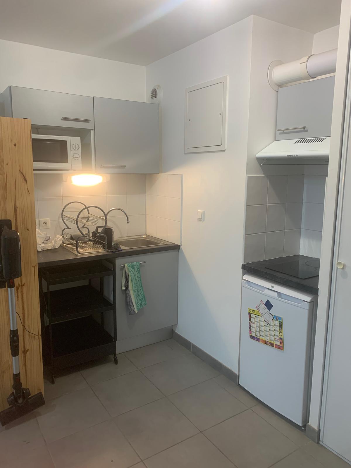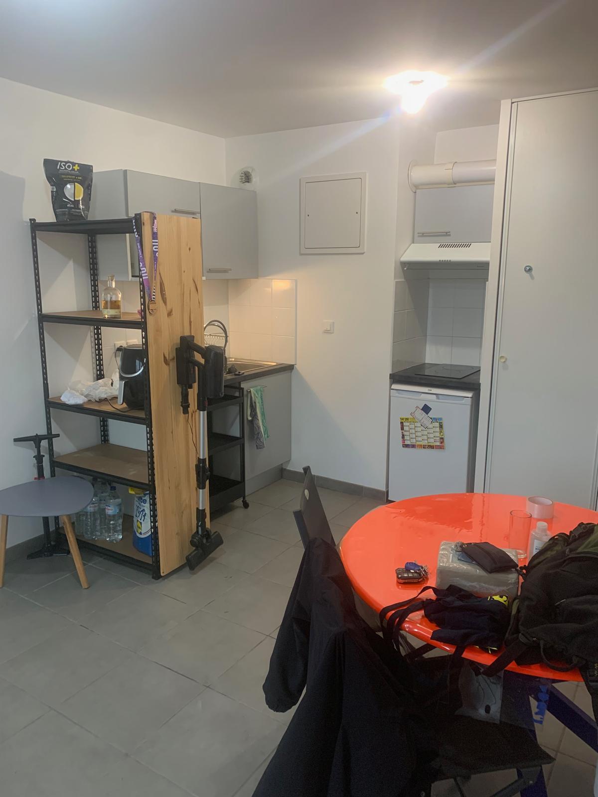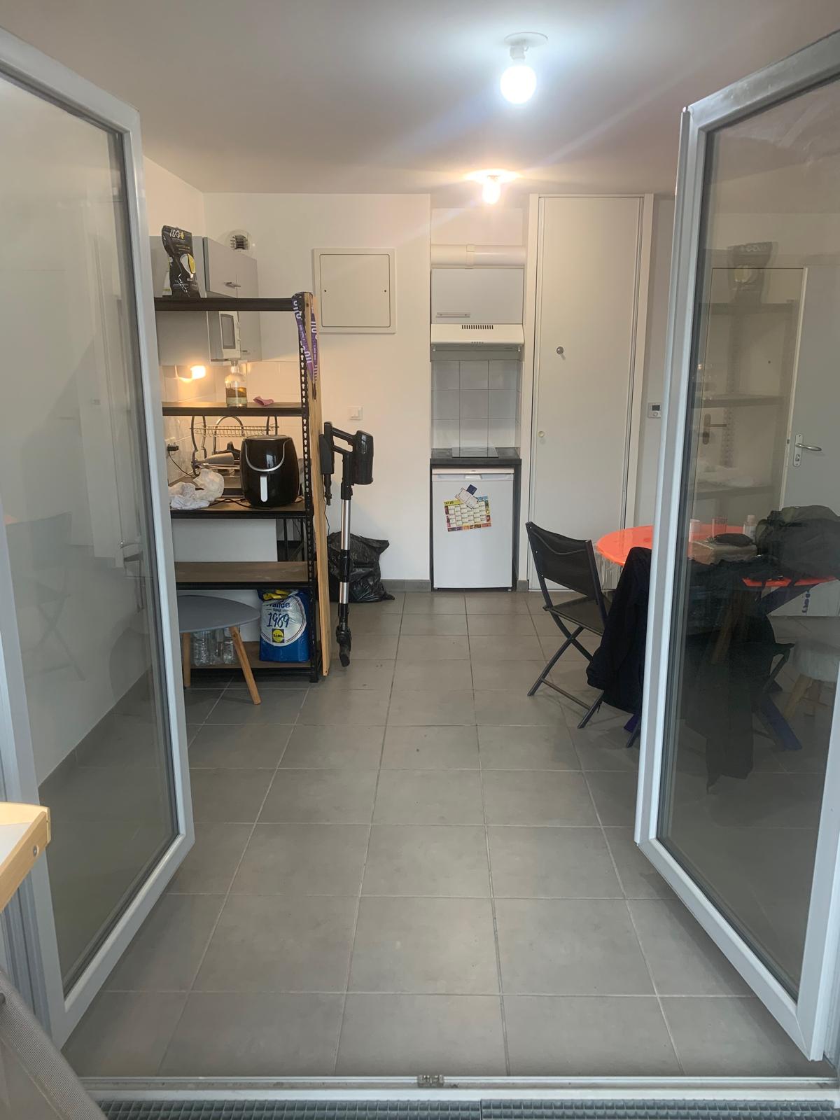 L’appartement se compose d’une entrée avec placards, d’un séjour lumineux avec cuisine ouverte, aménagée et équipée (plaque vitrocéramique 2 feux, hotte et rangements).