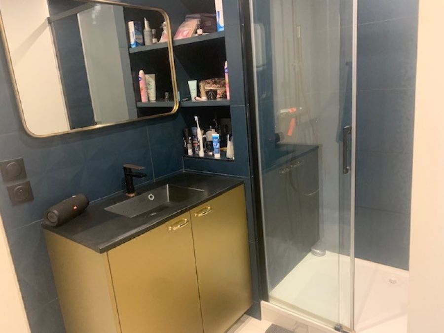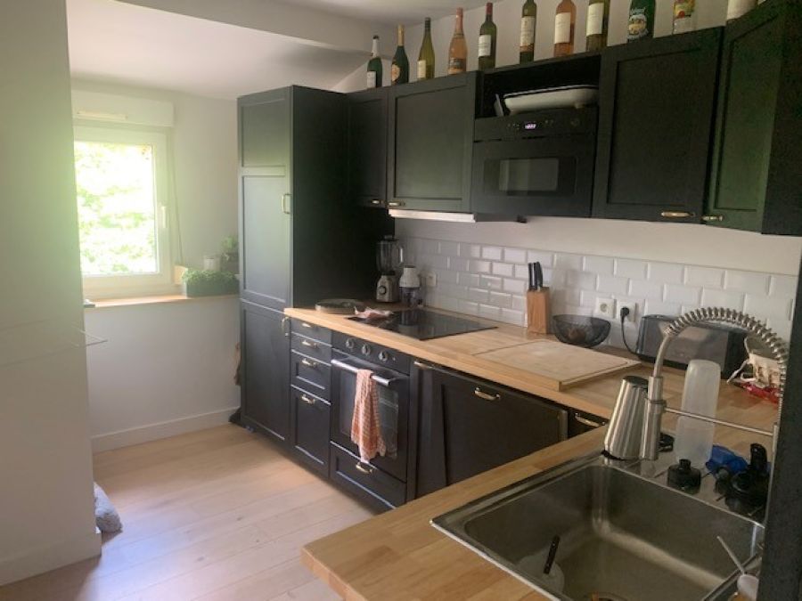 Le logement comprend une entrée avec WC, une cuisine aux couleurs modernes ouverte sur le séjour. Elle est équipée de meubles hauts et bas, plaques vitrocéramiques, frigo, four, hotte, vaisselle…. La pièce de vie spacieuse et lumineuse, donne sur un agréable balcon.