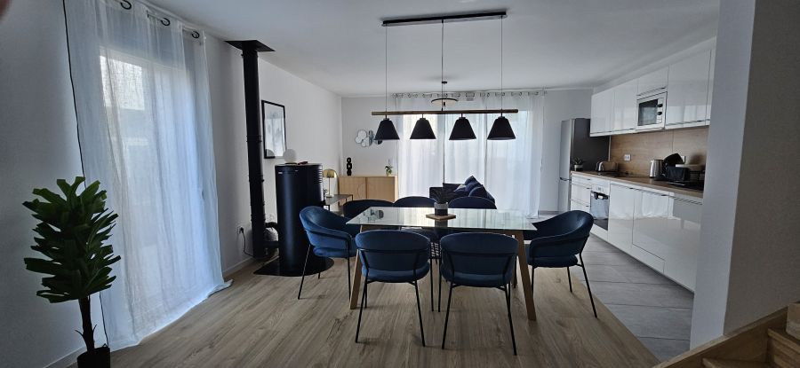 La maison offre une très belle pièce de vie avec son poêle à granulés, une belle cuisine équipée (hotte, plaque de cuisson, frigo, lave vaisselle, four, meubles de rangements, ustensiles de cuisine …) une terrasse de 36 m2, une première chambre au RDC meublée, une salle d’eau avec meuble vasque, sèche-serviette, une buanderie avec machine à laver. À l’étage deux chambres meublées, et une salle de bain. 2 boxes en sous sol complètent ce bien