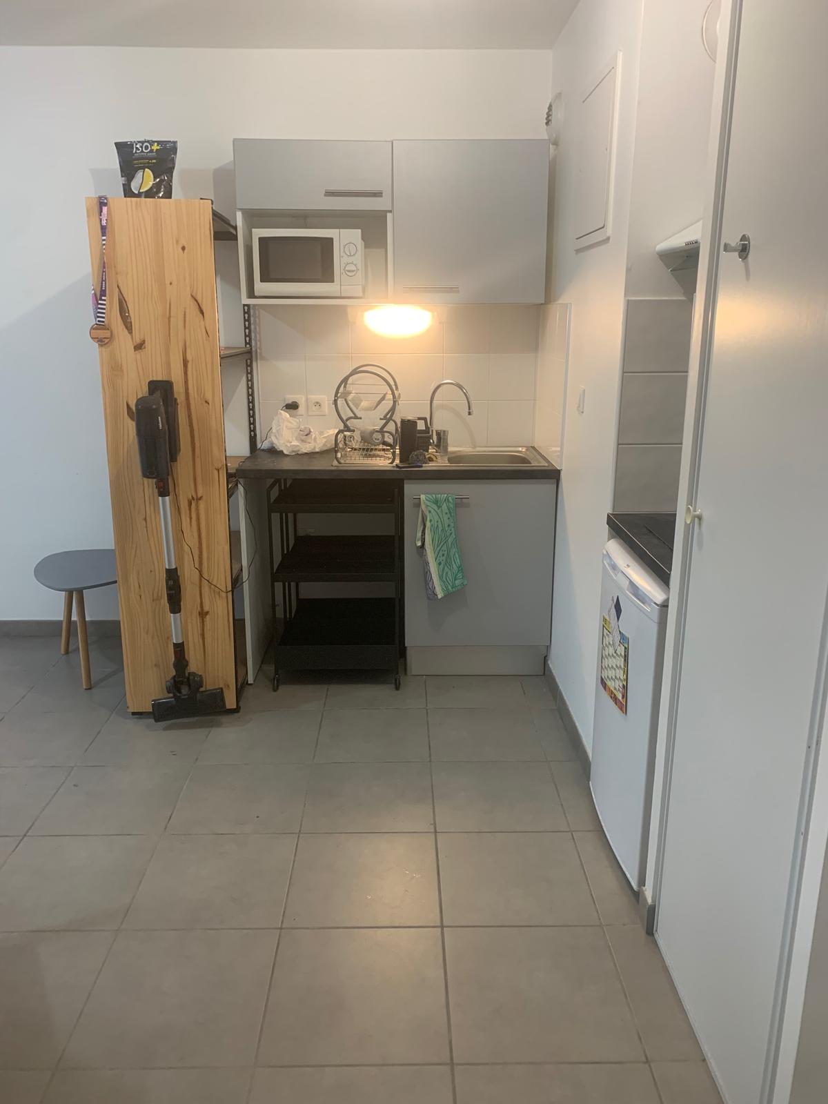 L’appartement se compose d’une entrée avec placards, d’un séjour lumineux avec cuisine ouverte, aménagée et équipée (plaque vitrocéramique 2 feux, hotte et rangements).