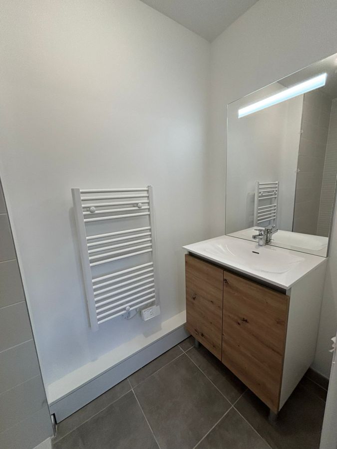 Le logement comprend une entrée, une cuisine aux couleurs modernes ouverte sur le séjour. Elle est équipée de meubles hauts et bas, plaques vitrocéramiques et hotte. La pièce de vie spacieuse et lumineuse, donne sur un agréable balcon avec un revêtement en brique de 7.08 m². Côté nuit une chambre avec placard. Une salle d’eau agrémentée de meuble sous vasque, miroir lumineux, sèche serviette.
