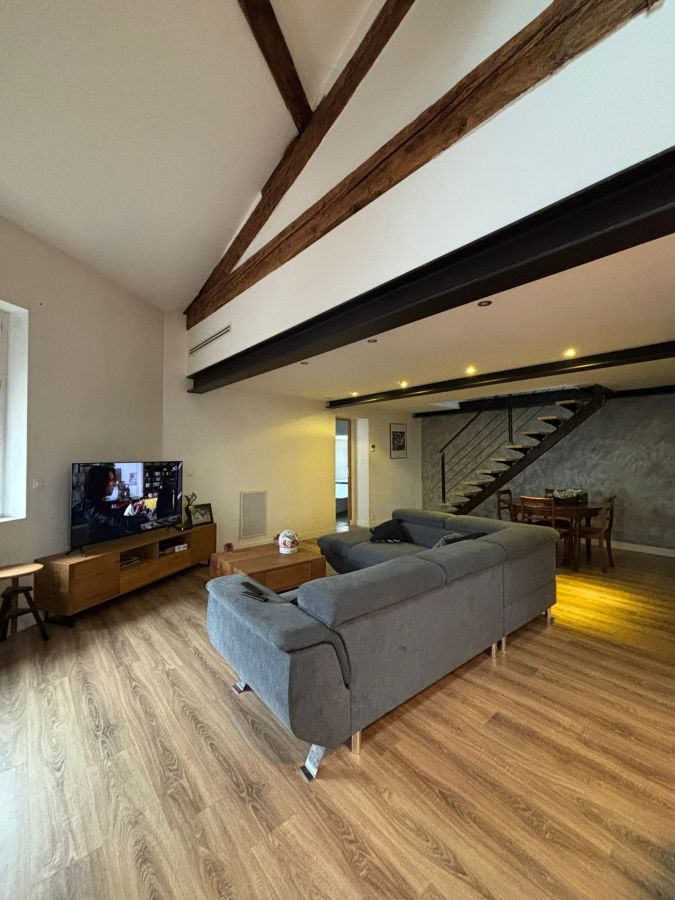 Le 1er niveau l'appartement est composé d'un grand espace de vie de 63 m², comprenant le séjour et la cuisine ouverte équipée avec ilot central (cave à vin, hotte amovible, un bar) et aménagée de nombreux rangements, une chambre parentale avec dressing aménagé, une grande salle d'eau avec une buanderie. A l'étage se trouve deux chambres avec rangements aménagés.