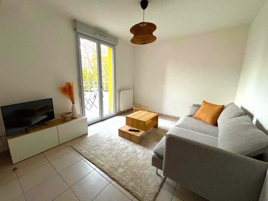 Ce logement meublé se compose d'une grande pièce de vie avec un espace salon composé d’un canapé et meuble tv.