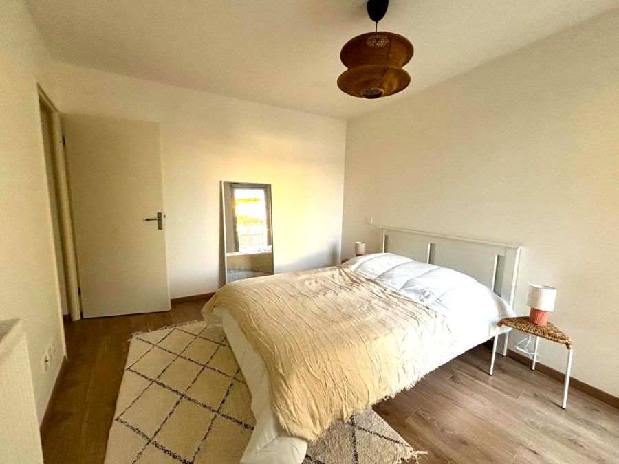 Une grande chambre de 13.29m2 avec armoire, lit et couverture avec un accès à la terrasse.