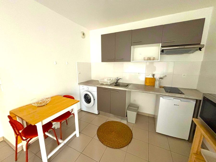 Une cuisine ouverte équipée (plaque de cuisson, hotte, frigo, rangement, vaisselle, lave linge...) une table à manger extensible, ainsi que tout le nécessaire.