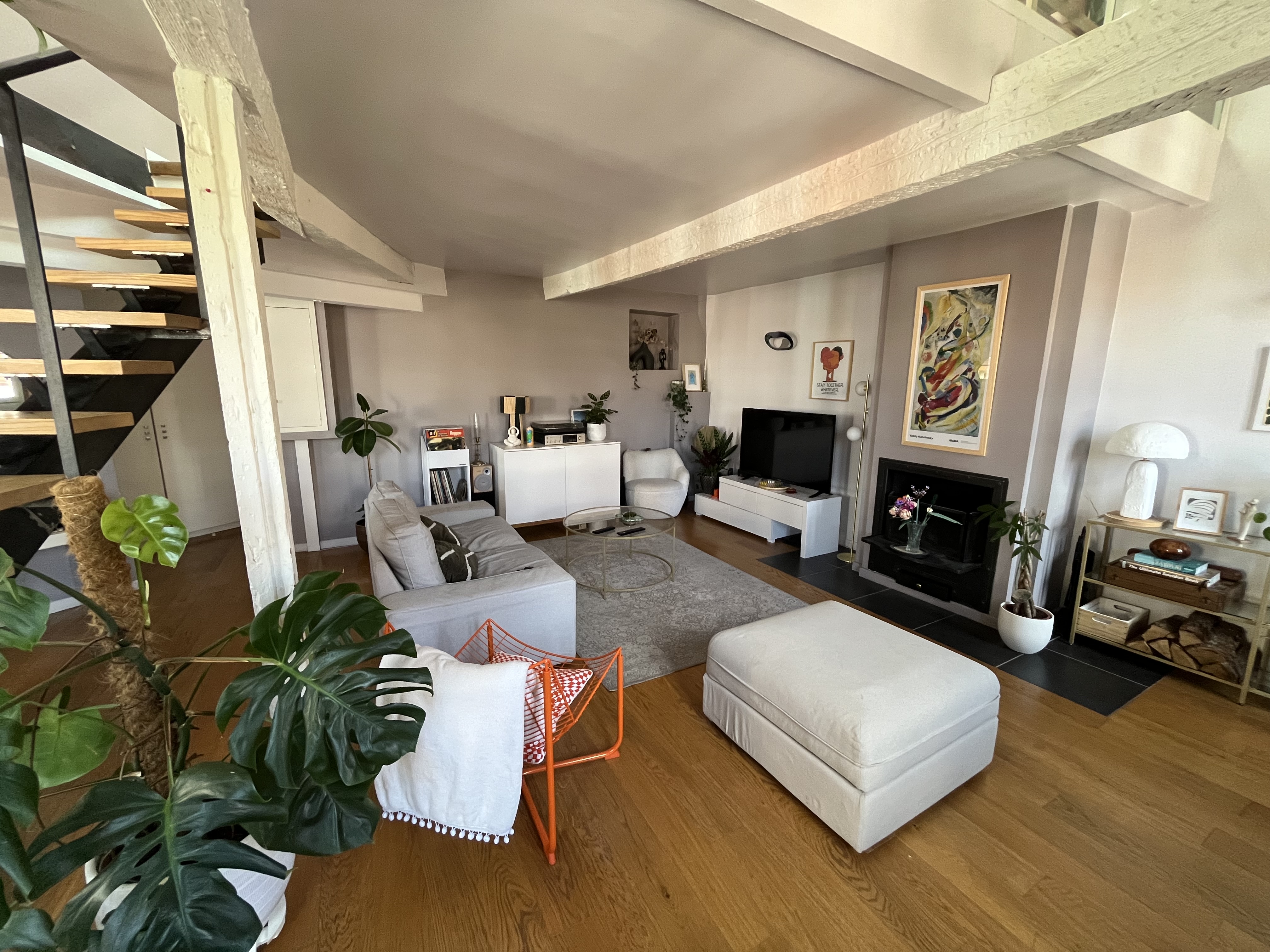 Au rez-de-chaussée, l’entrée avec placard est ouverte sur un grand espace séjour/cuisine. Avec une belle cheminée fonctionnelle, La cuisine est entièrement meublée et équipée (lave-vaisselle, four, micro-onde, frigo, congélateur, plaques chauffantes, ustensiles de cuisine). Un WC se trouve également au rez-de-chaussée.