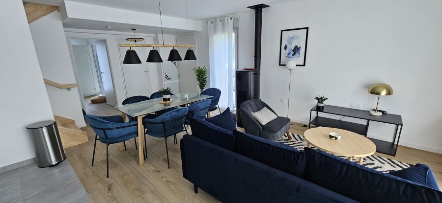 La maison offre une très belle pièce de vie avec son poêle à granulés, une belle cuisine équipée (hotte, plaque de cuisson, frigo, lave vaisselle, four, meubles de rangements, ustensiles de cuisine …) une terrasse de 36 m2, une première chambre au RDC meublée, une salle d’eau avec meuble vasque, sèche-serviette, une buanderie avec machine à laver. À l’étage deux chambres meublées, et une salle de bain. 2 boxes en sous sol complètent ce bien